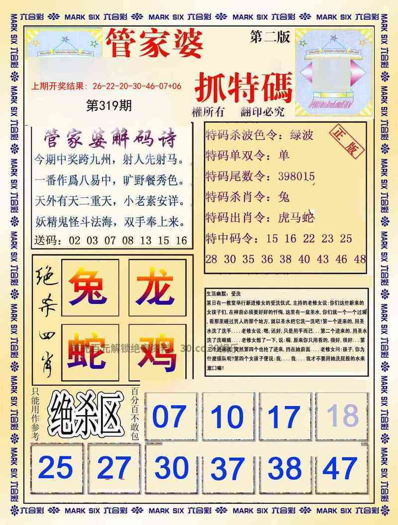 | 311期:家野两肖【野兽+羊鸡】开:蛇37准 |